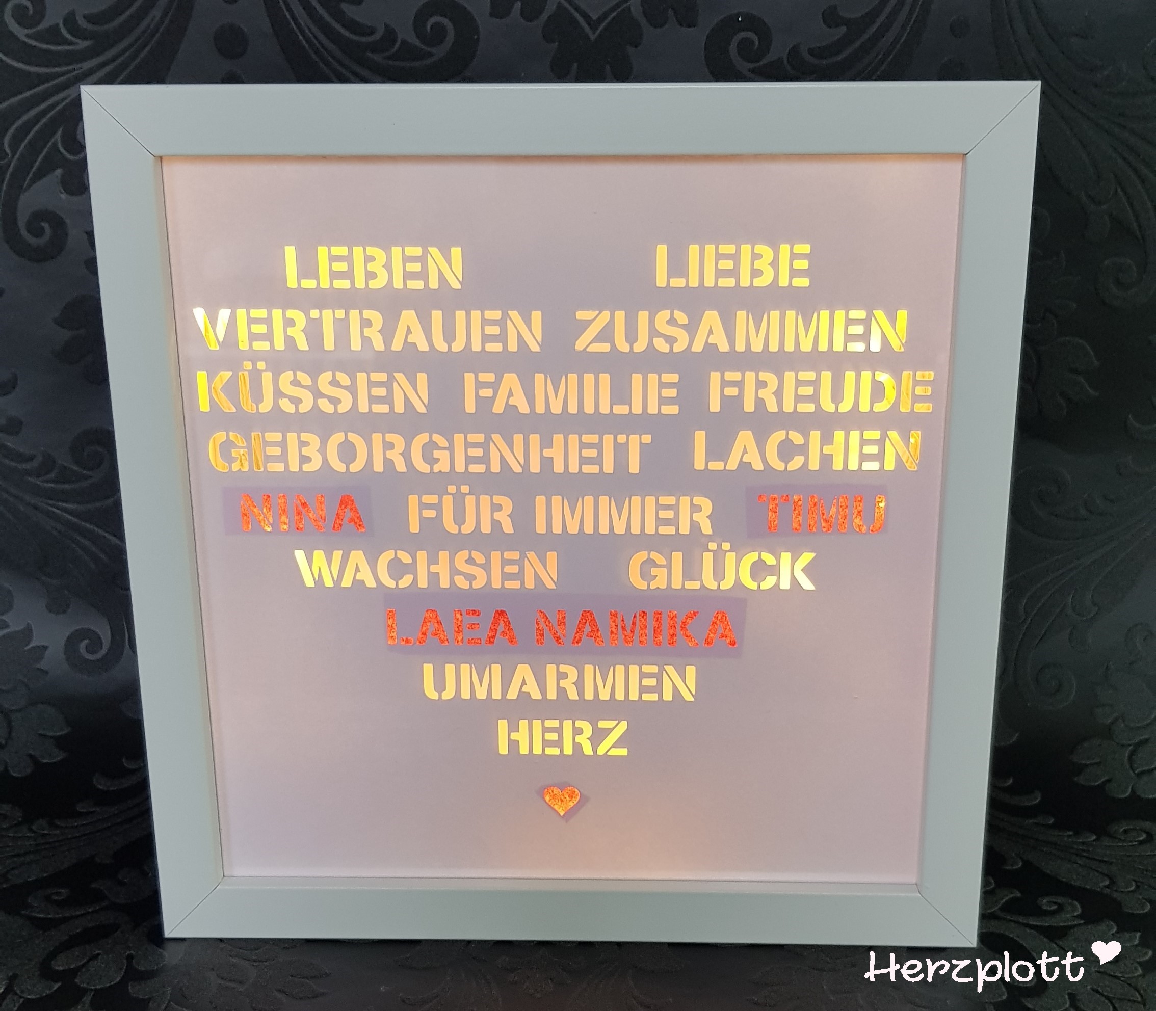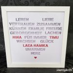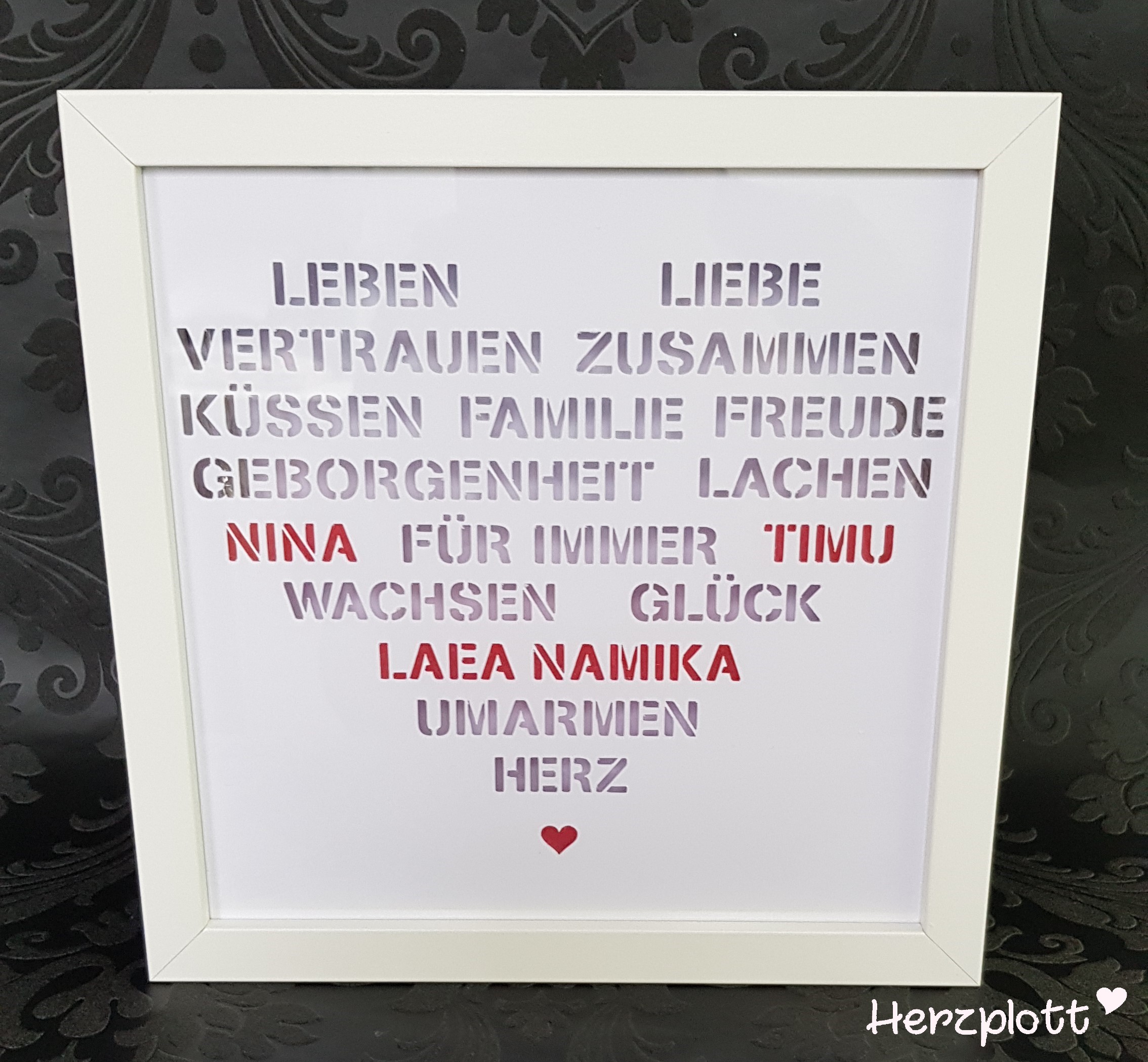 Ich habe in einem großen Herz einige schöne Wörter die zu einer Familie gehören angeordnet und mit einer Stencil Schrift ausschneiden lassen.
