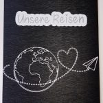 Auf den Ordner habe ich ein schönes Reisemotiv geplottet. ,,Unsere Reisen” habe ich in Silber auf ein weißes Offset gesetzt.