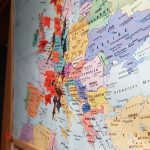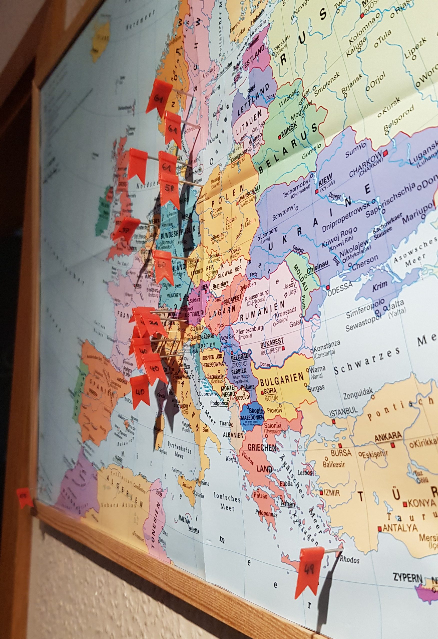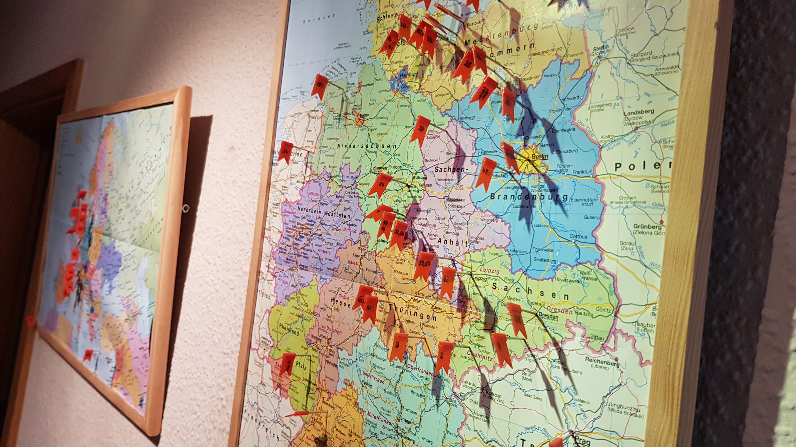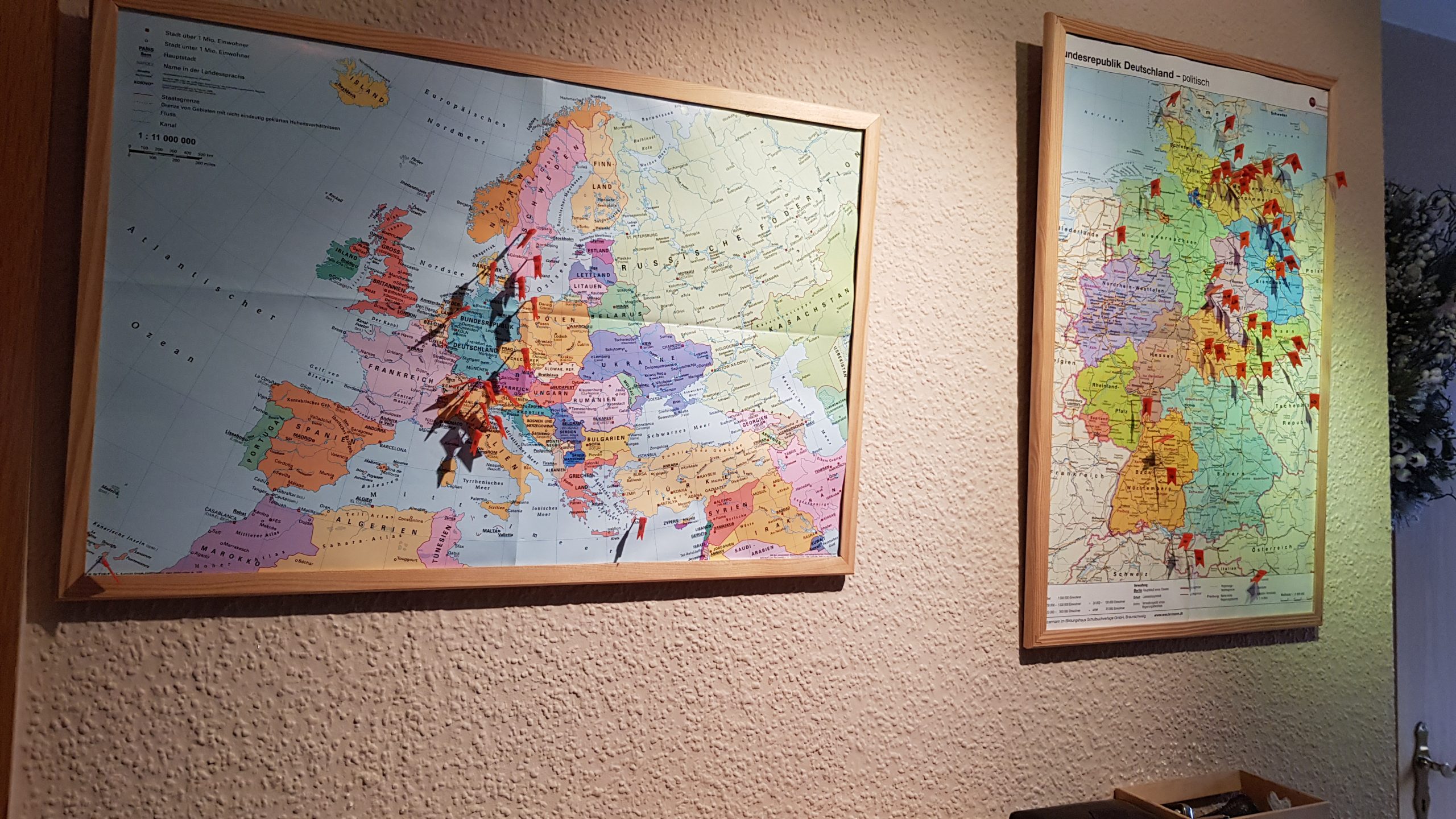 Um unsere Reisen nicht durch langes suchen durch die Fotoalben wach zu halten, habe ich im Flur Landkarten angebracht. Auf diese Karten stecken in den bereisten Orten nummerierte Fähnchen. 🚩 In einem Ordner habe ich die Reisen aufgelistet. So können wir schnell nachschlagen und unsere Erinnerungen immer mal wieder wachrufen.