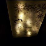 herzlich Willkommen bei uns Zuhause” habe ich mit einer schwarzen Vinylfolie auf das Glas der Laterne aufgebracht. Die Schneeflocken habe ich auf eine Folie gedruckt, die ich somit, je nach Jahreszeit, auswechseln kann.