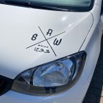 Auf der Motorhaube des kleinen weißen Flitzers hat das von mir entworfene Kreuzbuchstaben Since Logo von Salzwedel seinen Platz gefunden.