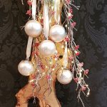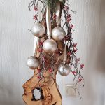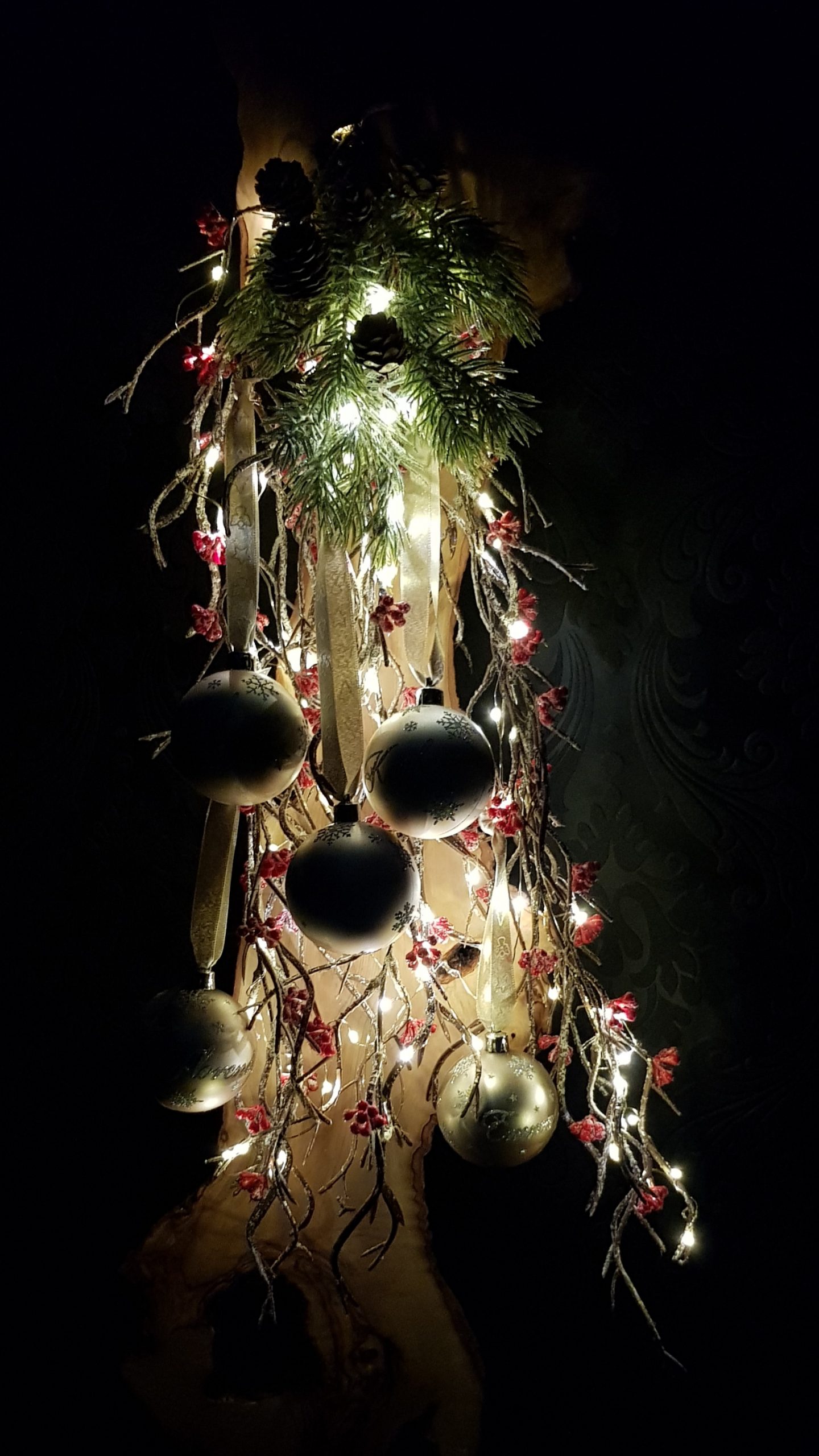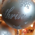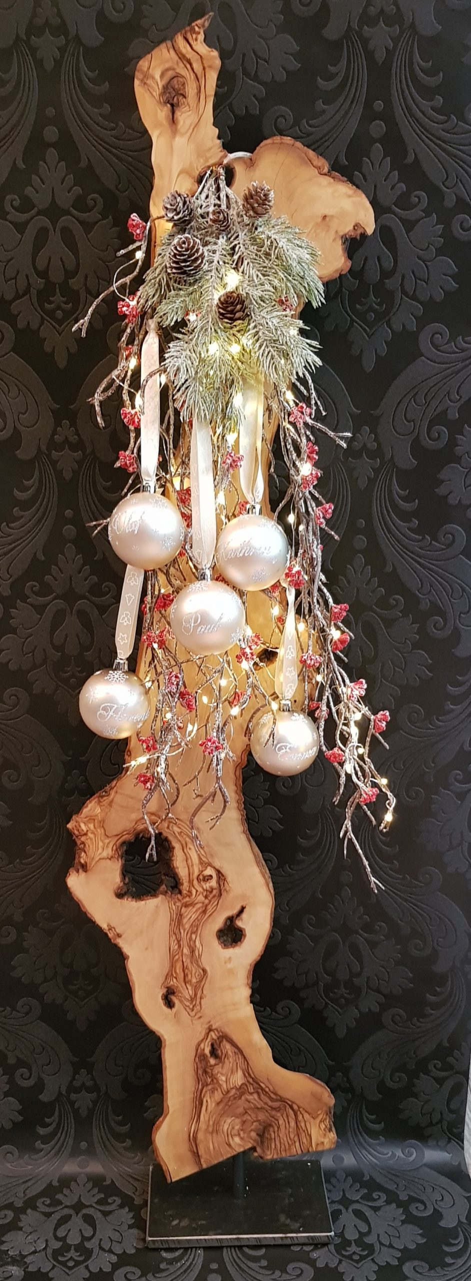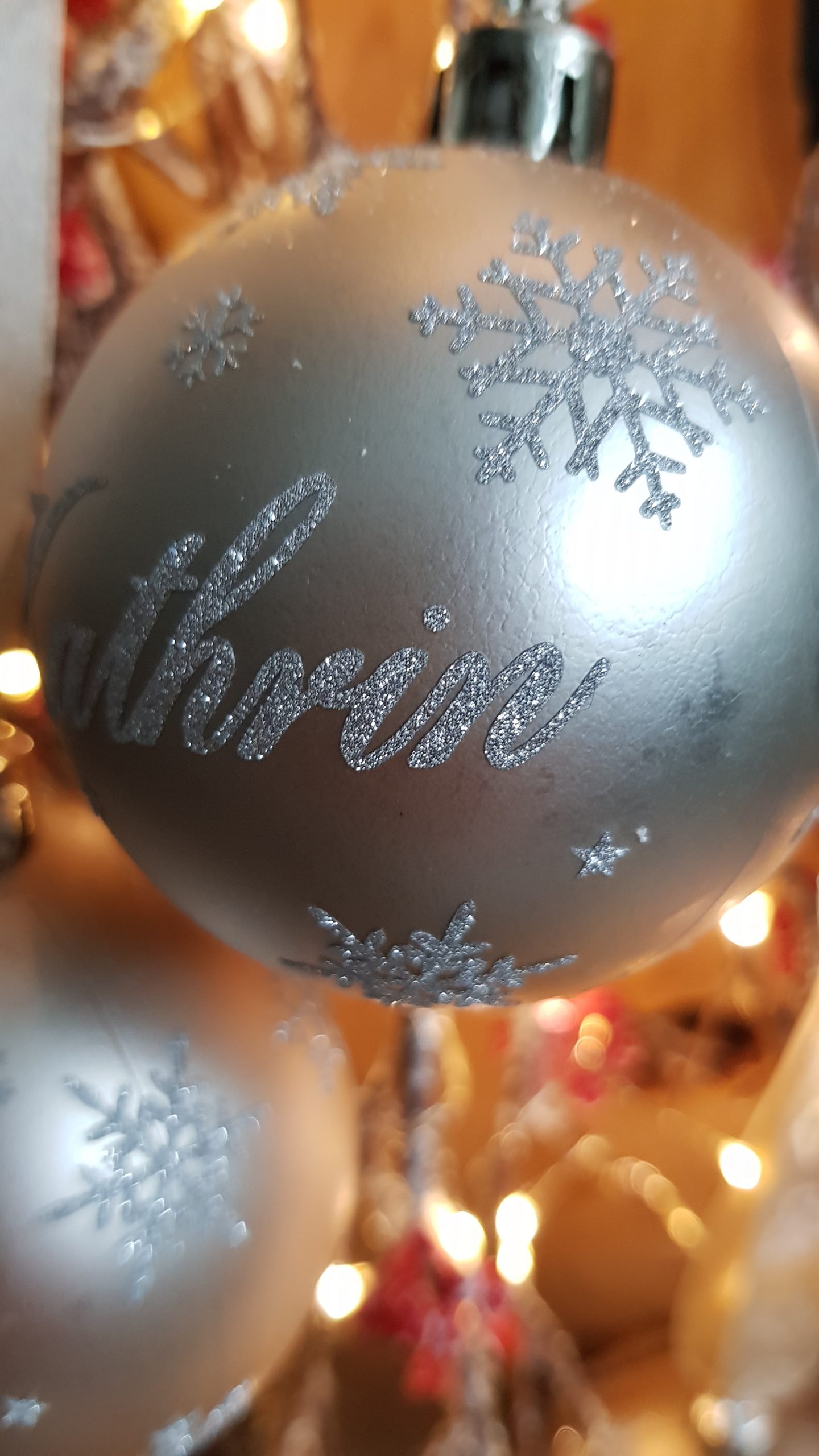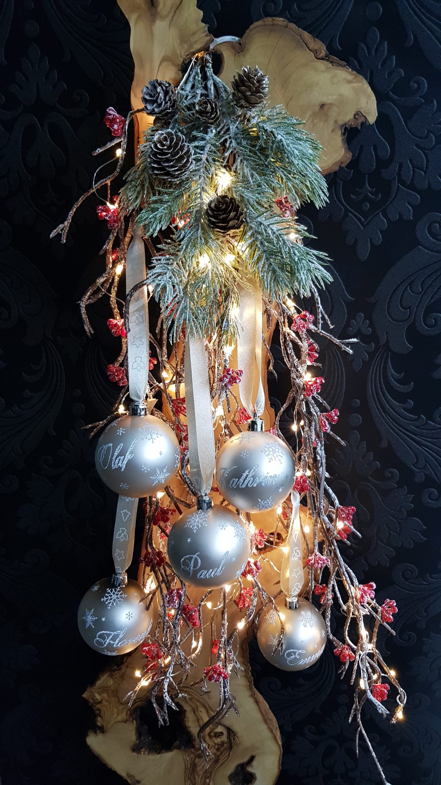 Ich durfte den Aufsteller weihnachtlich dekorieren. Dazu habe ich die Namen der Familienmitglieder mit einer Glitzerfolie in Silber auf die Kugeln aufgetragen und alle anderen Dekoartikel mit einander stimmig arrangiert.