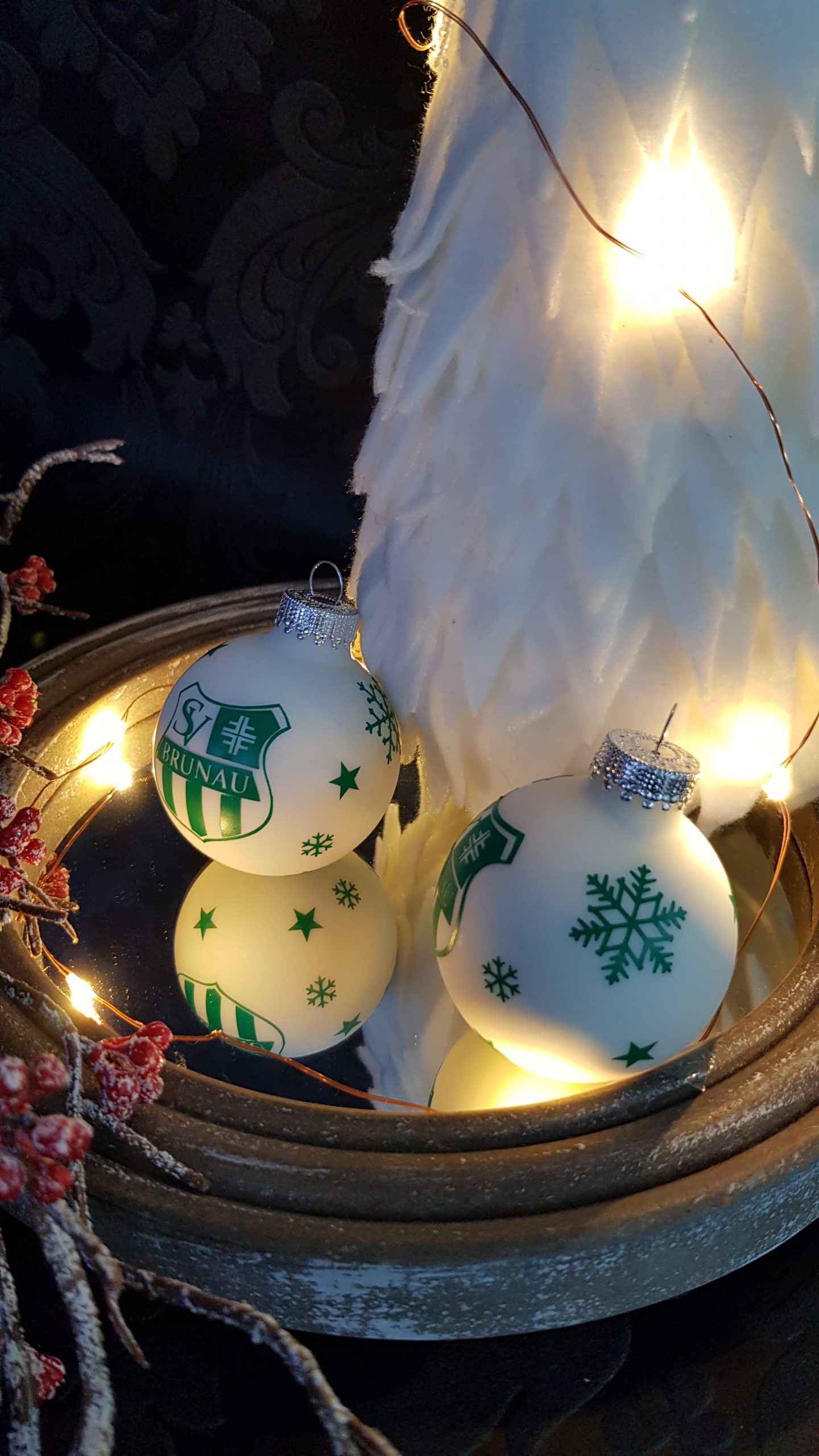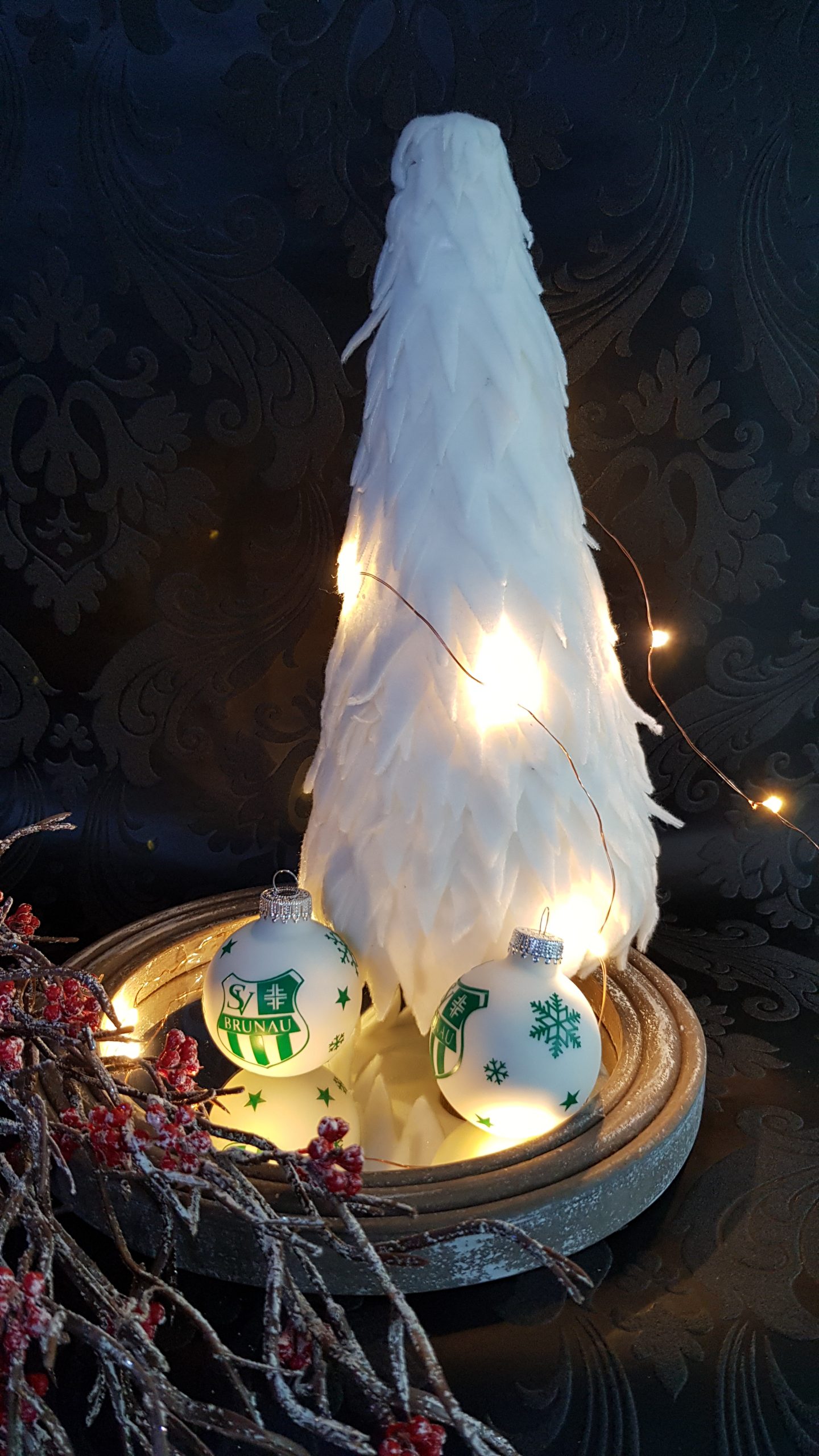 Dieses Jahr versucht mein Arbeitskollege Gewinner zu werden. 🤗 Die Chancen stehen nicht schlecht, denn die Kugeln die seinen Baum schmücken, zeigen den Fußballverein in dem die Männer spielen. ⚽️