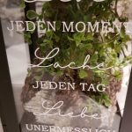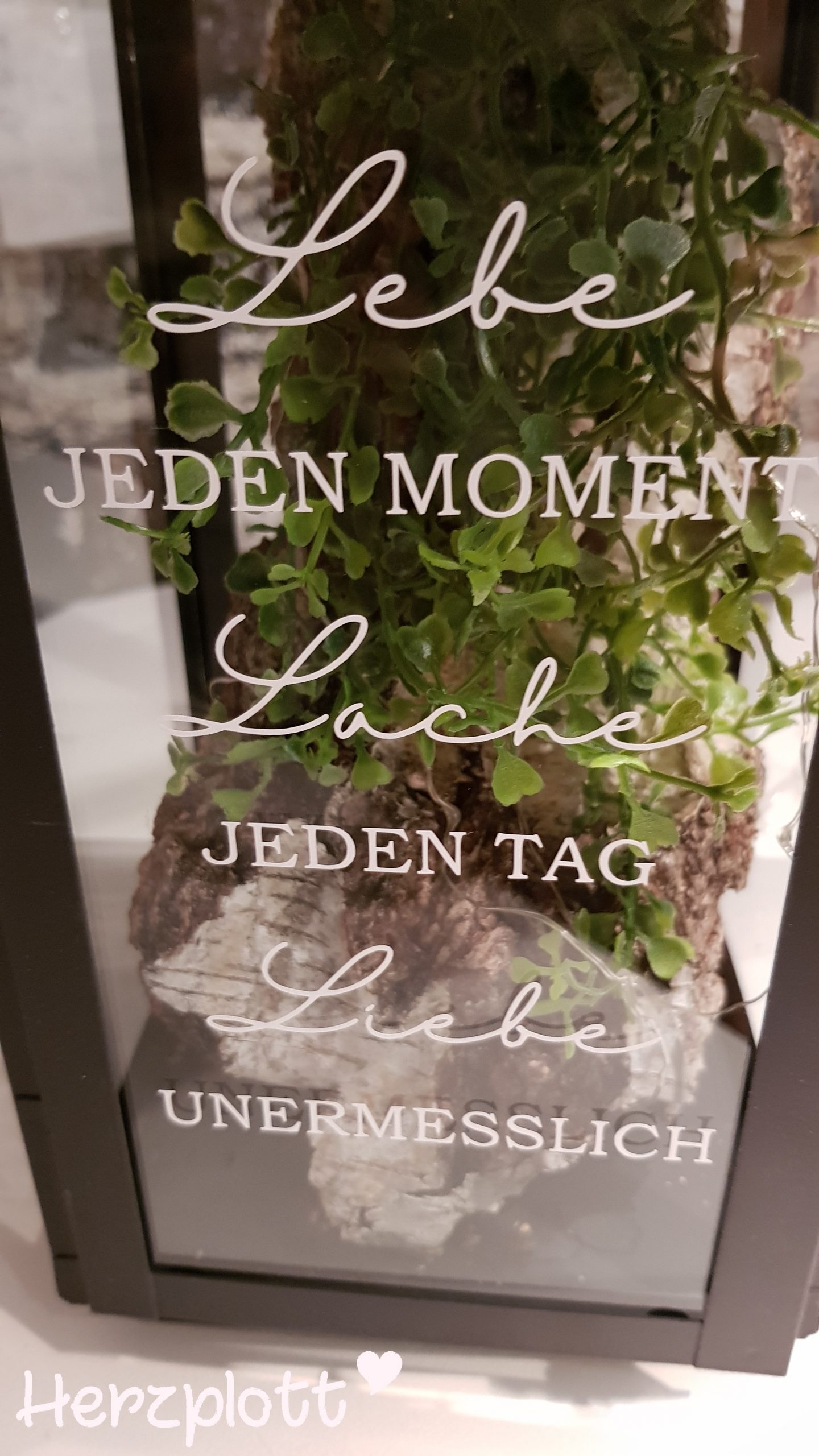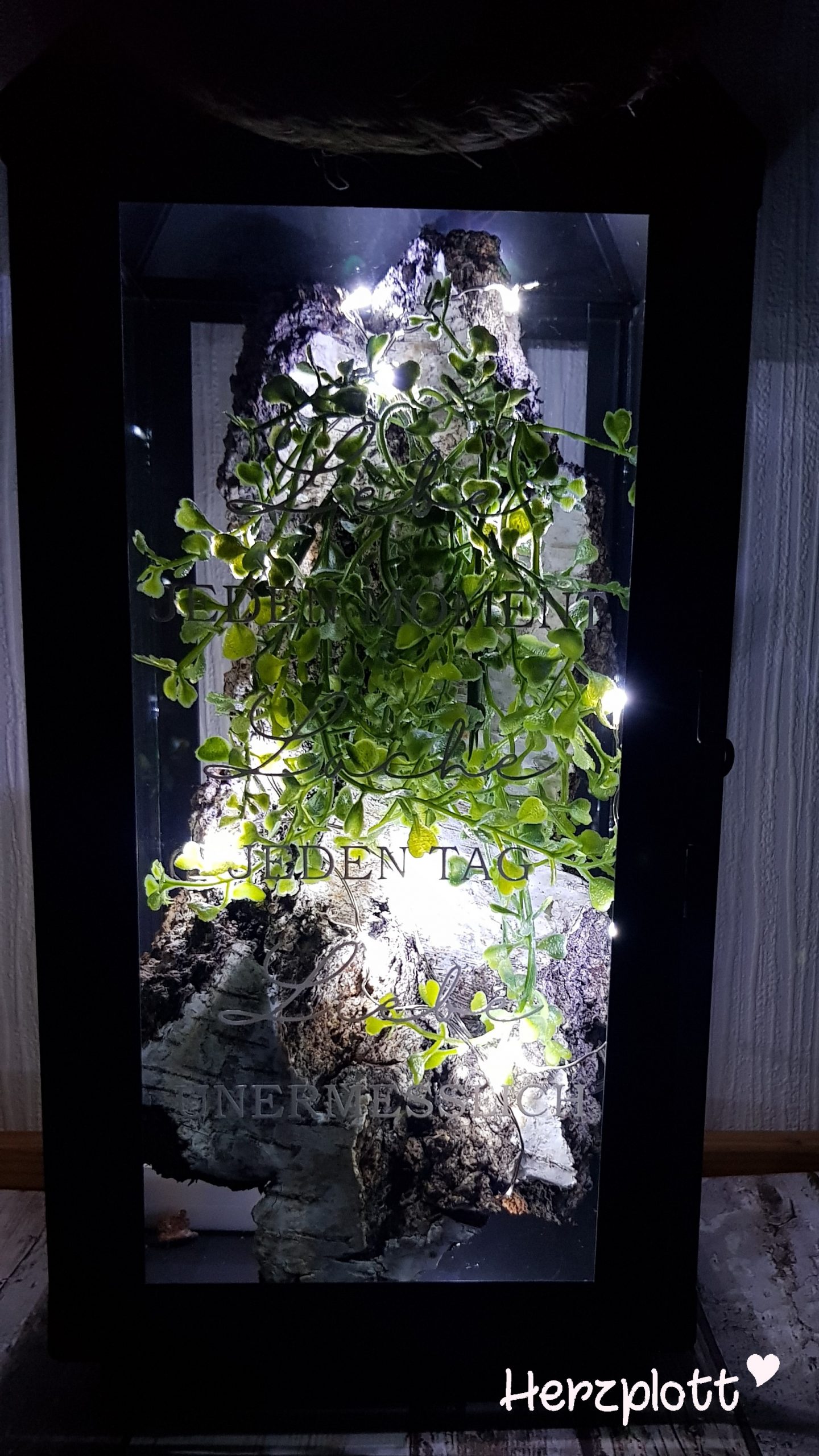 Dazu habe ich den Spruch auf die vordere Scheibe geplottet. Ein Stück Birkenrinde mit einem künstlichen Zweig versehen und drumherum eine Lichterkette mit einem Timer gewunden.