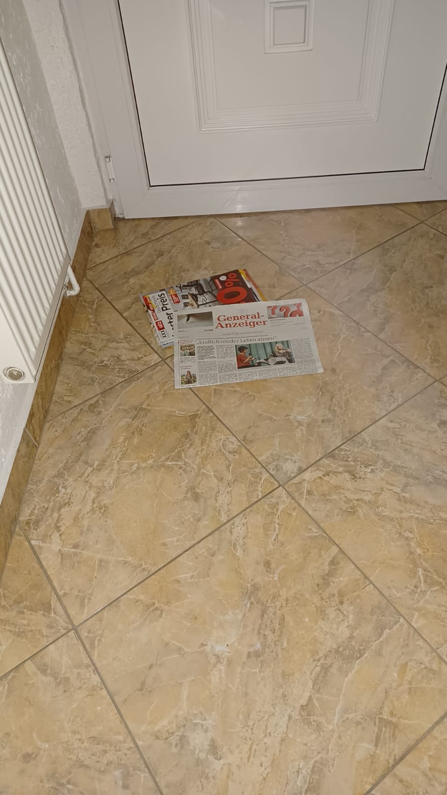 Fast jeden Morgen war Petras Zeitung nass, weil der Austräger sie nicht richtig durch den Briefschlitz durchgeschoben hat.