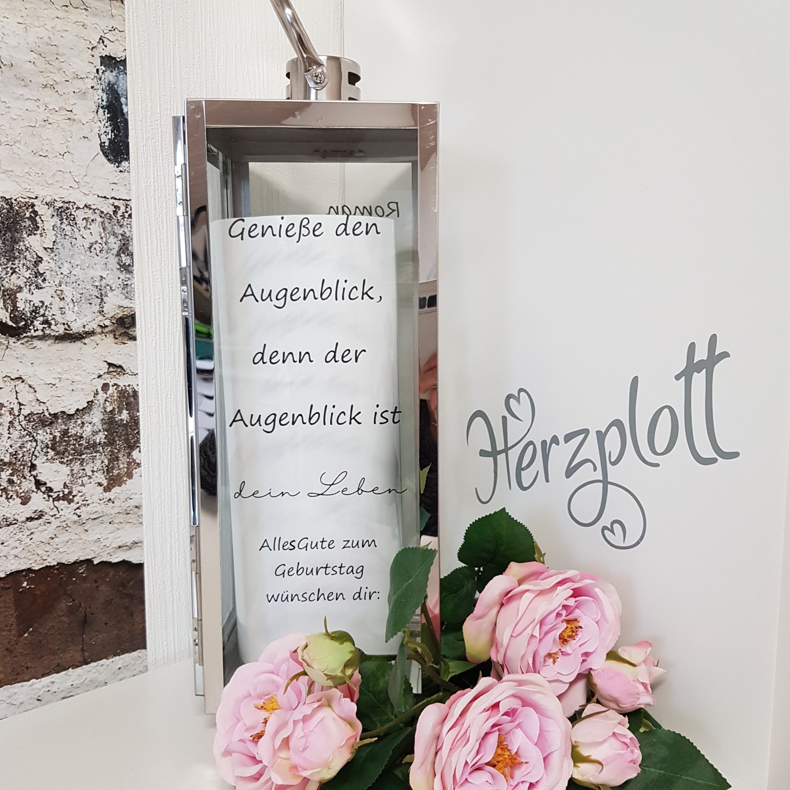 Diese Laterne ist zu einem 40. Geburtstag verschenkt worden. Auf der gegenüberliegenden Seite des Textes sind alle aufgeführt, die dem “Geburtstagkind” gratulieren.