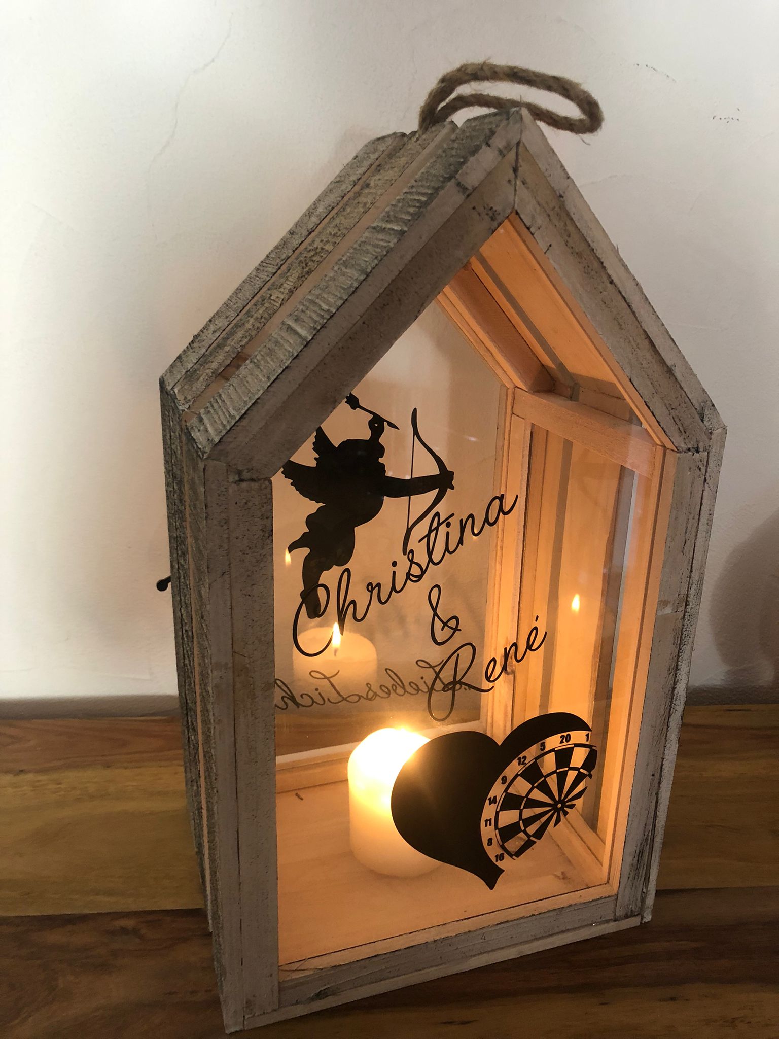 Für Melli und Rainer habe ich vor längerer Zeit Aufkleber erstellt. Nun haben sie mich gefragt, ob ich ihnen bei einem Hochzeitsgeschenk helfen könnte. Melli hat eine Laterne besorgt und möchte den beiden Dartspielern Christina und René mit einem Liebeslicht eine Überraschung machen. Wir haben zusammen nach passenden Motiven gesucht. Ich habe ihr die Aufkleber zugeschickt und sie hat sie dann auf die Laterne aufgebracht. Die Laterne ist bei dem Brautpaar sehr gut angekommen. 🥰