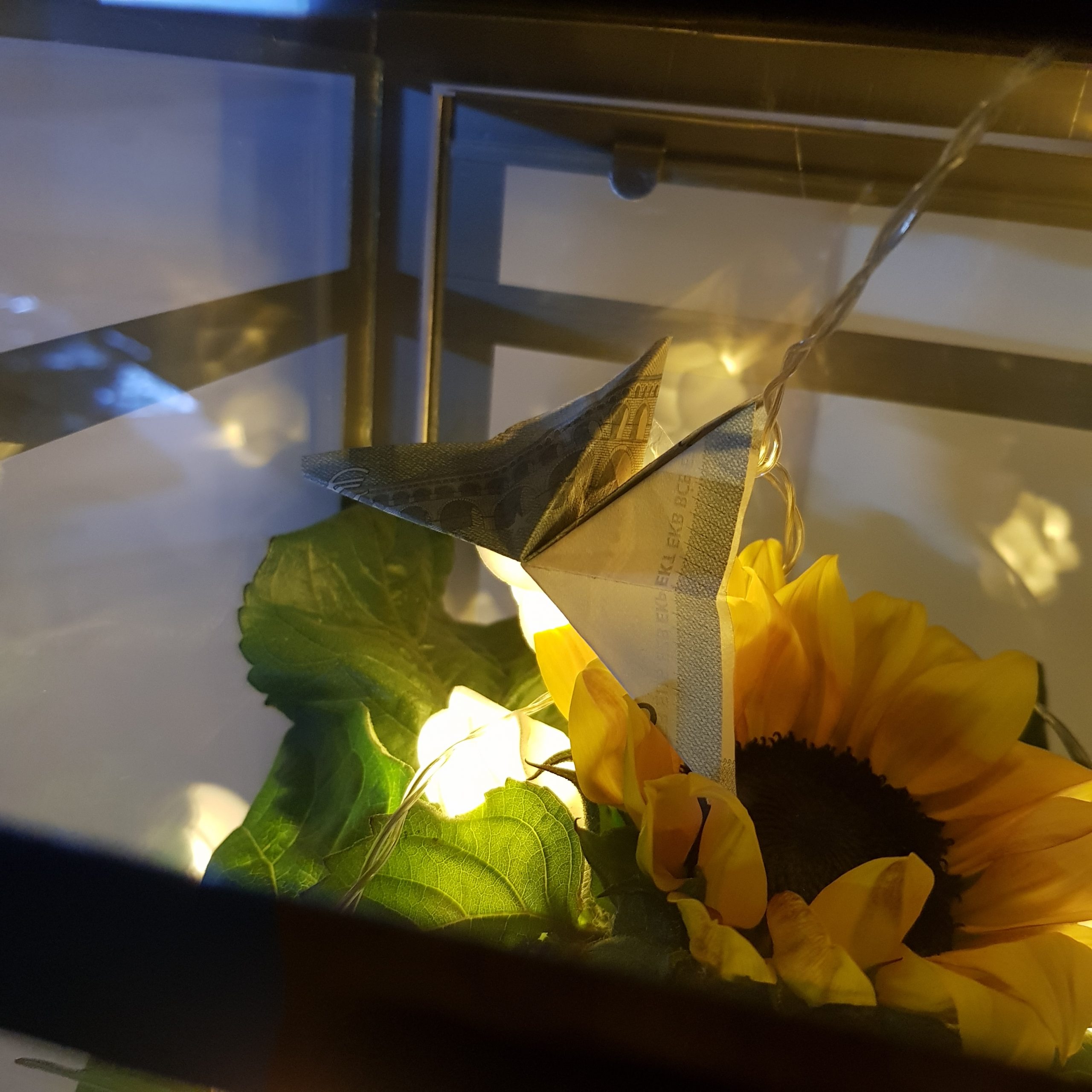 Das Geld, welches wir für sie gesammelt haben, habe ich als Schmetterlinge an die Rosenlichterkette befestigt.
