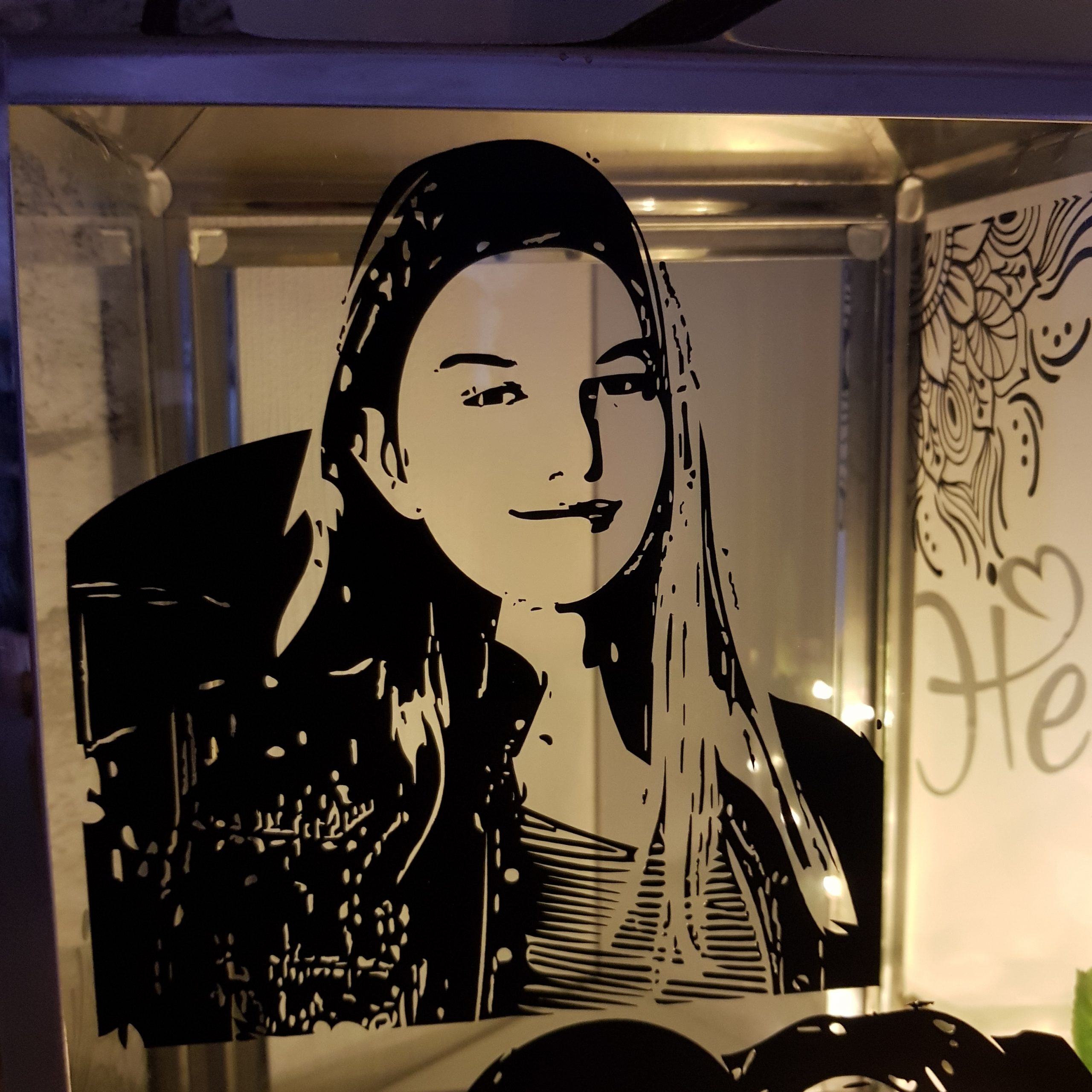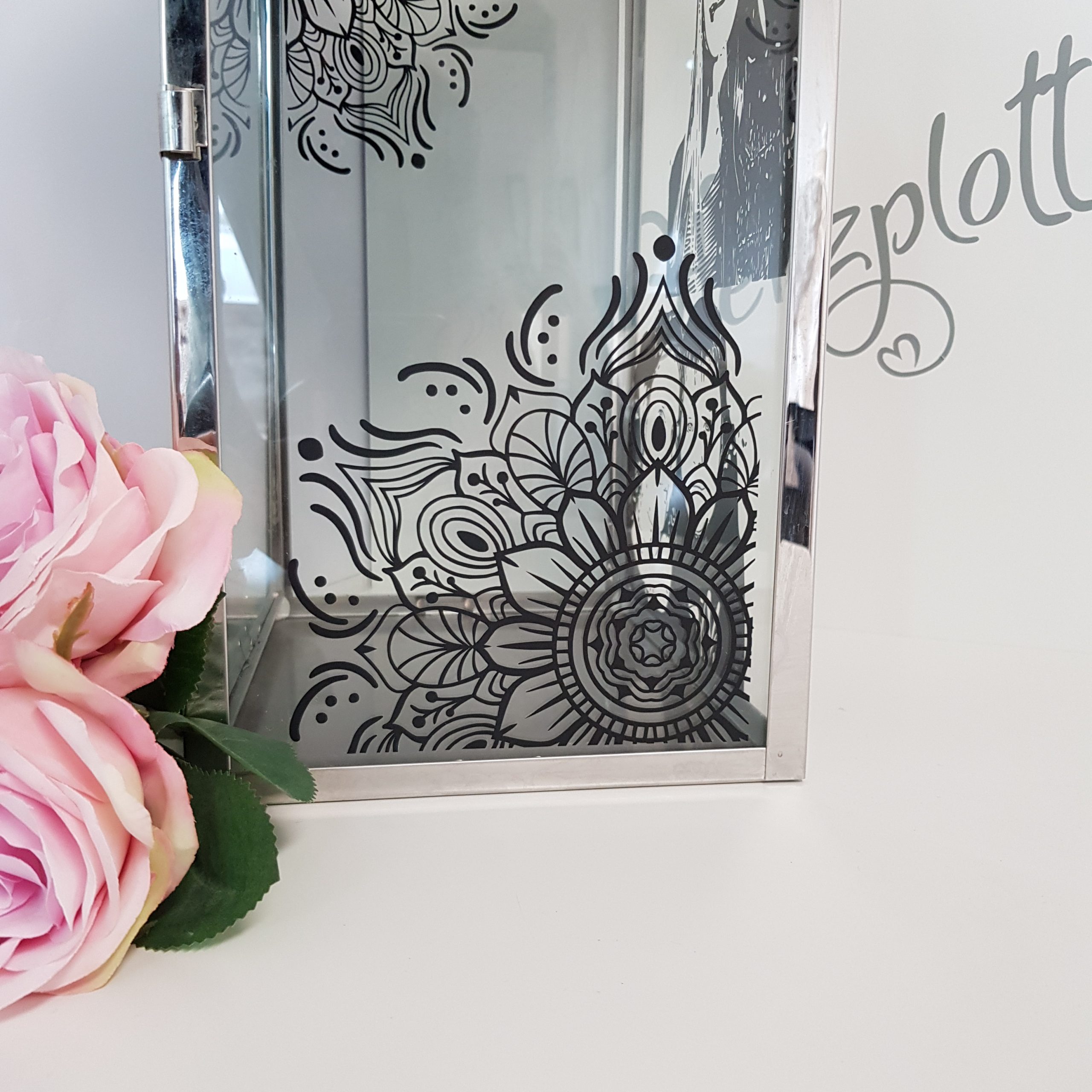 Diese Laterne habe ich wieder mit umgewandelten Fotos beplottet. Auf die Seitenscheiben habe ich wieder ein Mandala aufgesetzt.