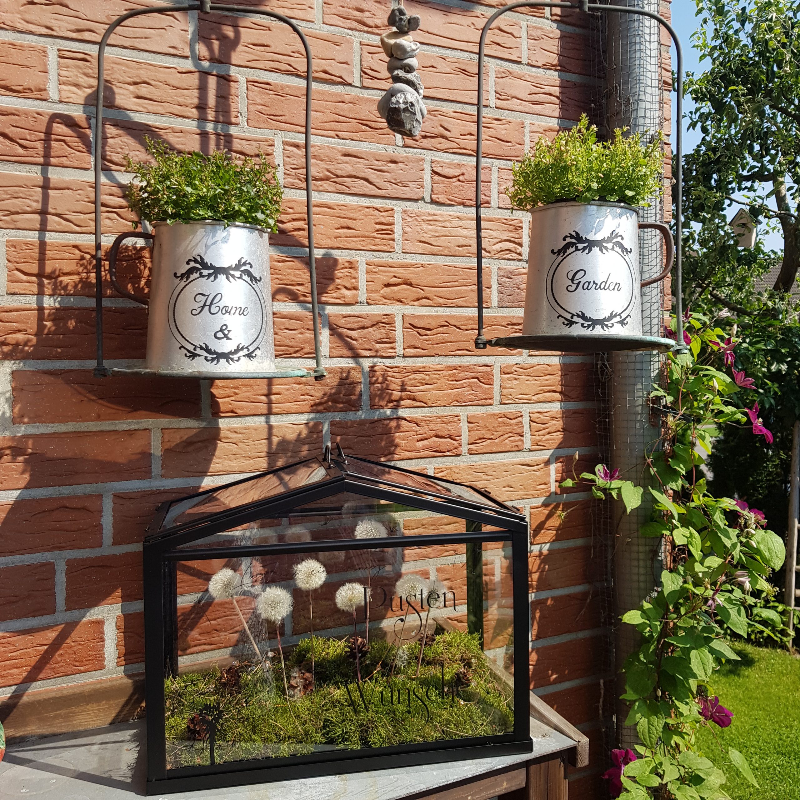 Dieses kleine Gewächshaus habe ich mit einem kleinen Spruch versehen und mit meinen im Frühjahr “konservierten” Pusteblumen und einer Lichterkette dekoriert.