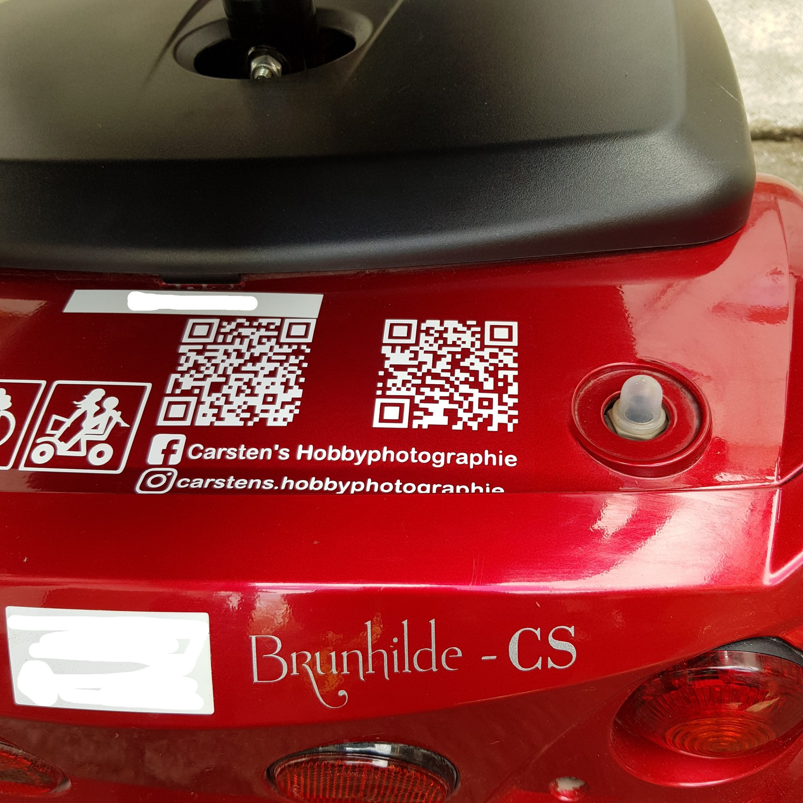 Um ihn dort schneller zu finden, hat er nun auf Brunhilde die QR Codes zu seinen Seiten zu kleben.