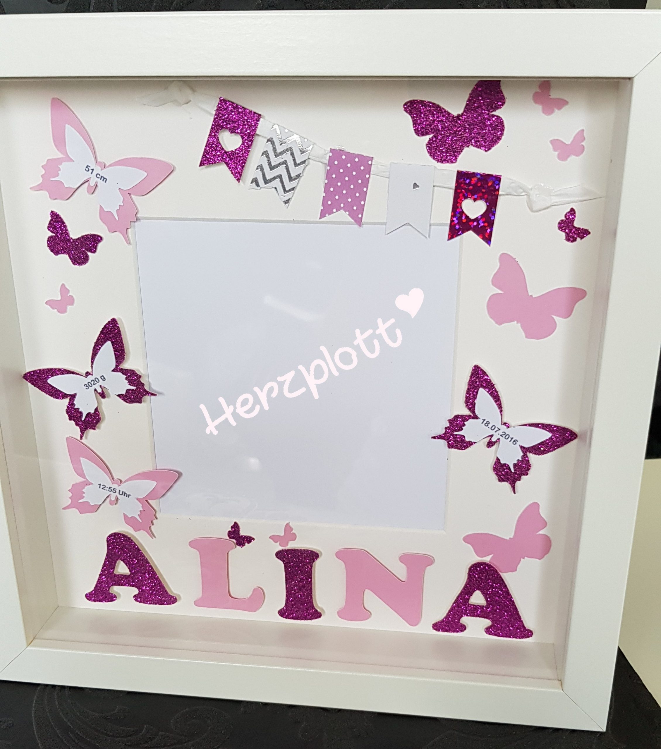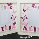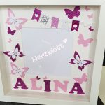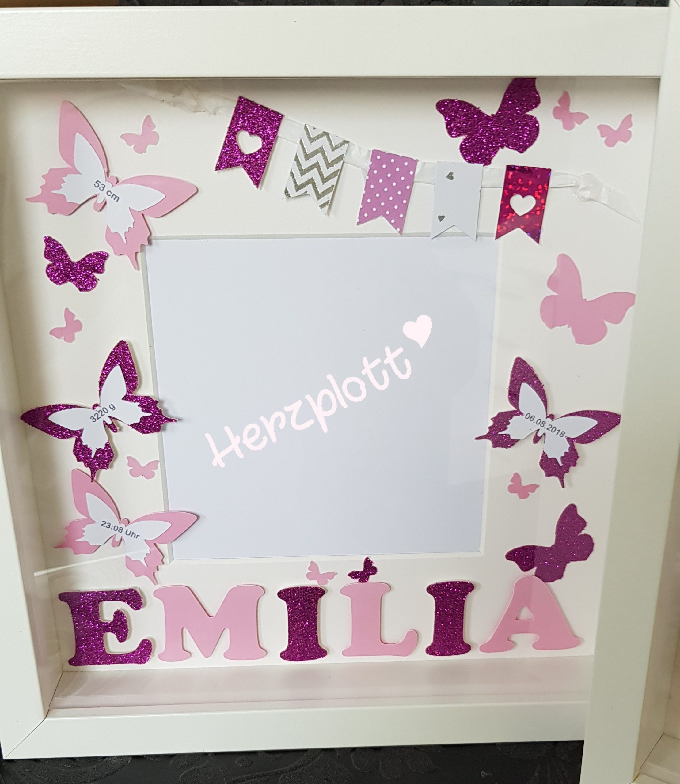 Diese Rahmen sind ein Geschenk für eine kleine Familie. Die Geschwister Alina und Emilia sind zwei Jahre auseinander. In die Mitte der Rahmen wird ein Foto aus den ersten Lebenswochen von ihnen kommen. Auf einigen Schmetterlingen sind die wichtigsten Fakten der Kinder geschrieben. So wird es sicherlich eine schöne Erinnerung an die erste Zeit der Beiden sein. 😍