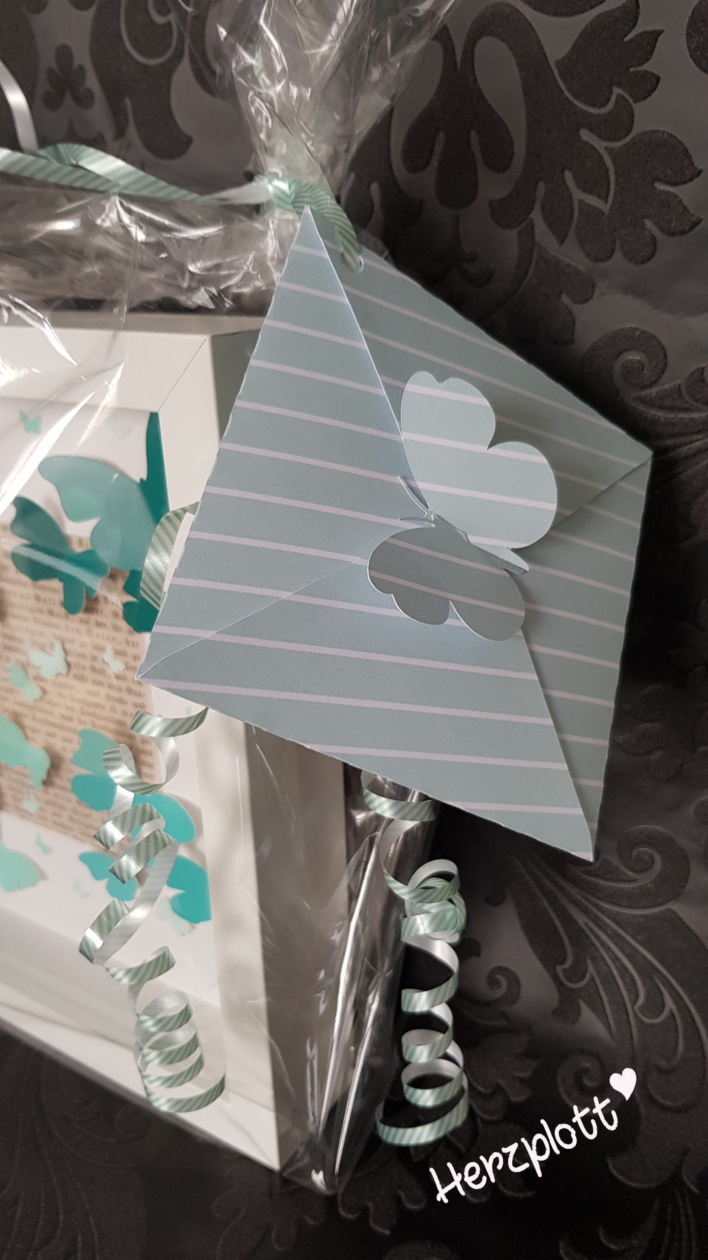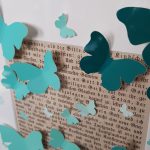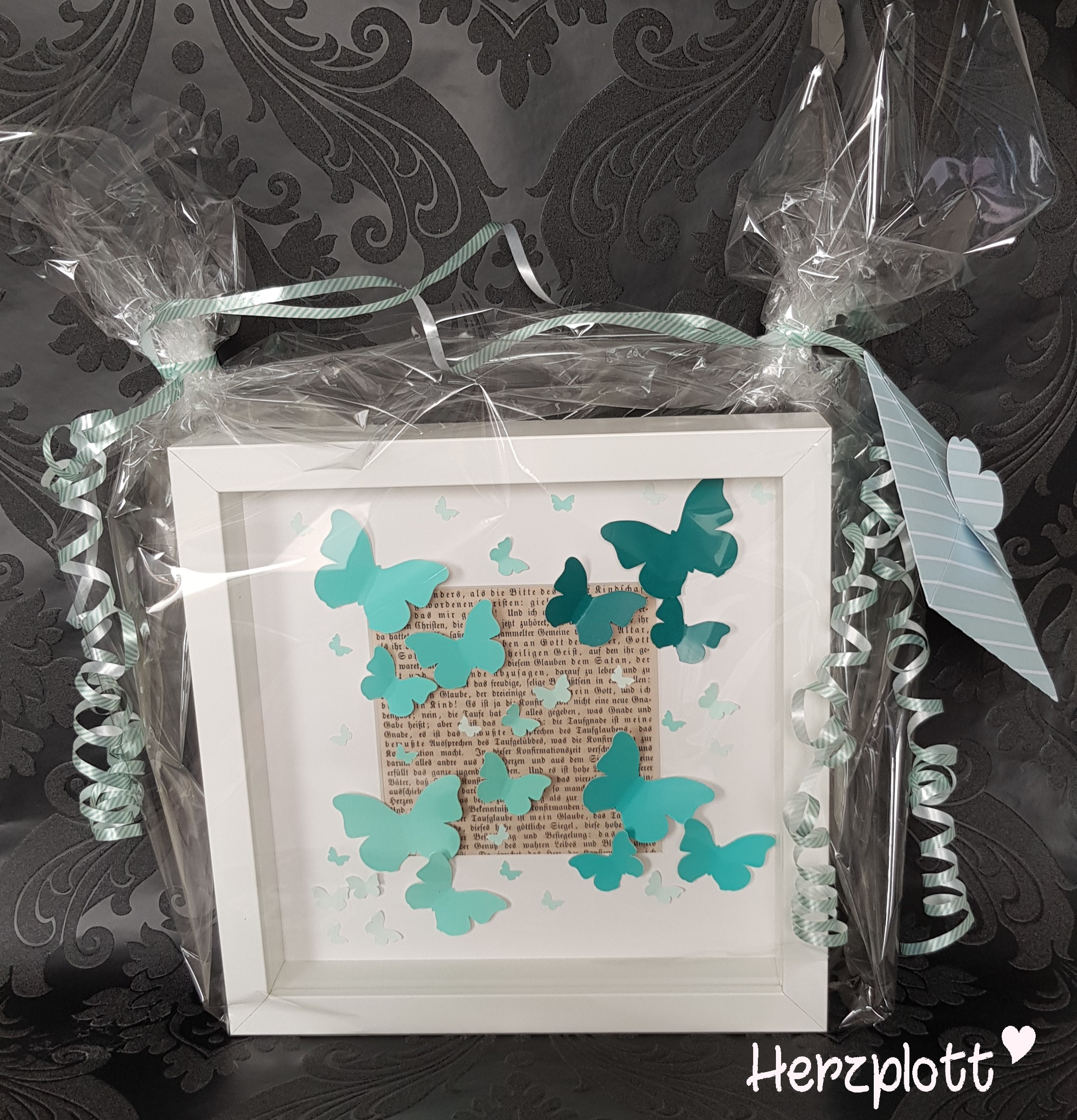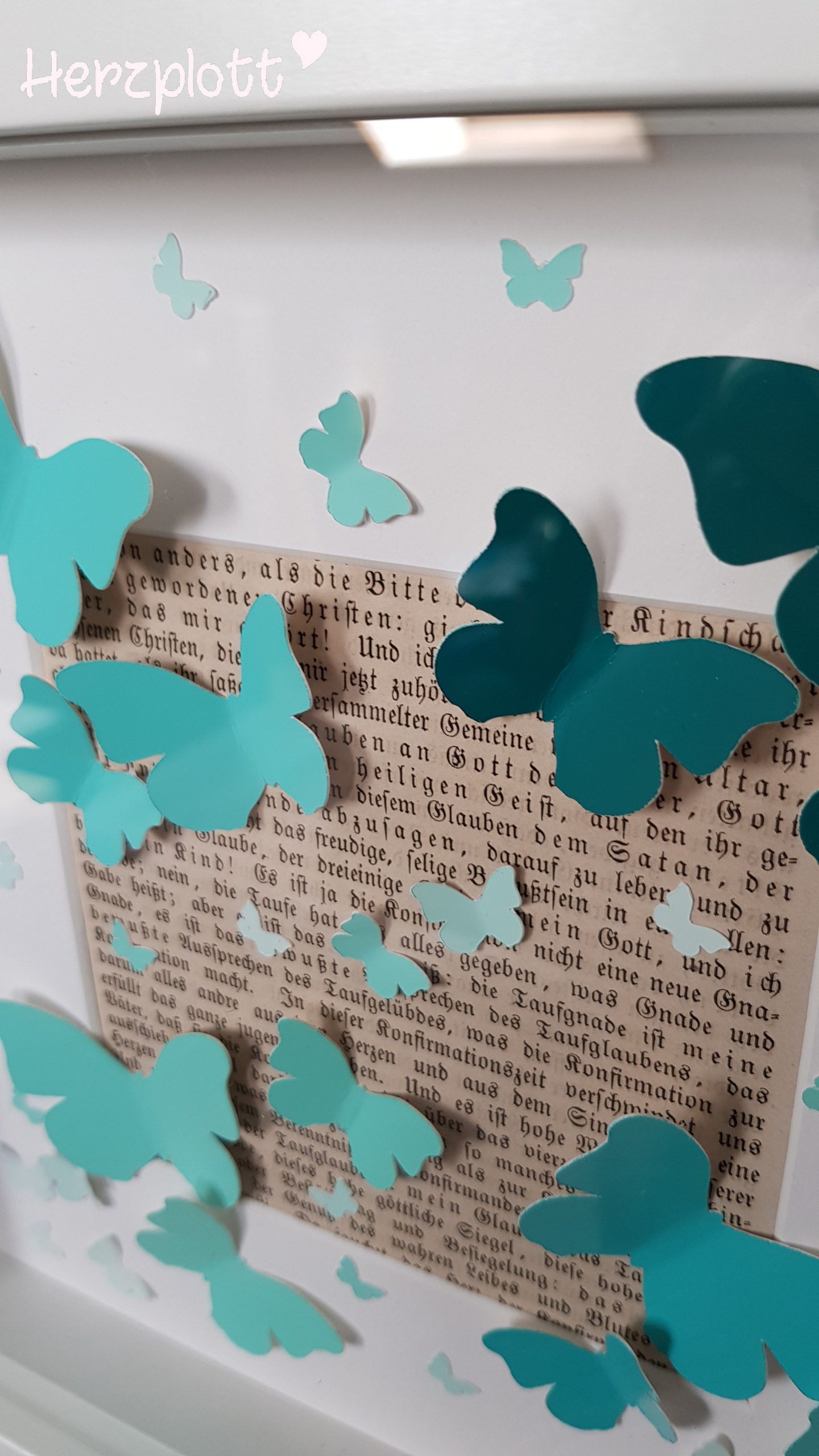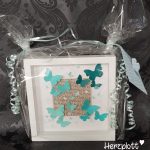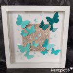 Diesen Rahmen haben wir zu einem 50. Geburtstag verschenkt. Farblich habe ich die türkisen Töne für die Schmetterlinge gewählt, da die Beschenkten in ihrem Wohnzimmer mit türkisen Dekoartikeln Blickpunkte gesetzt haben.