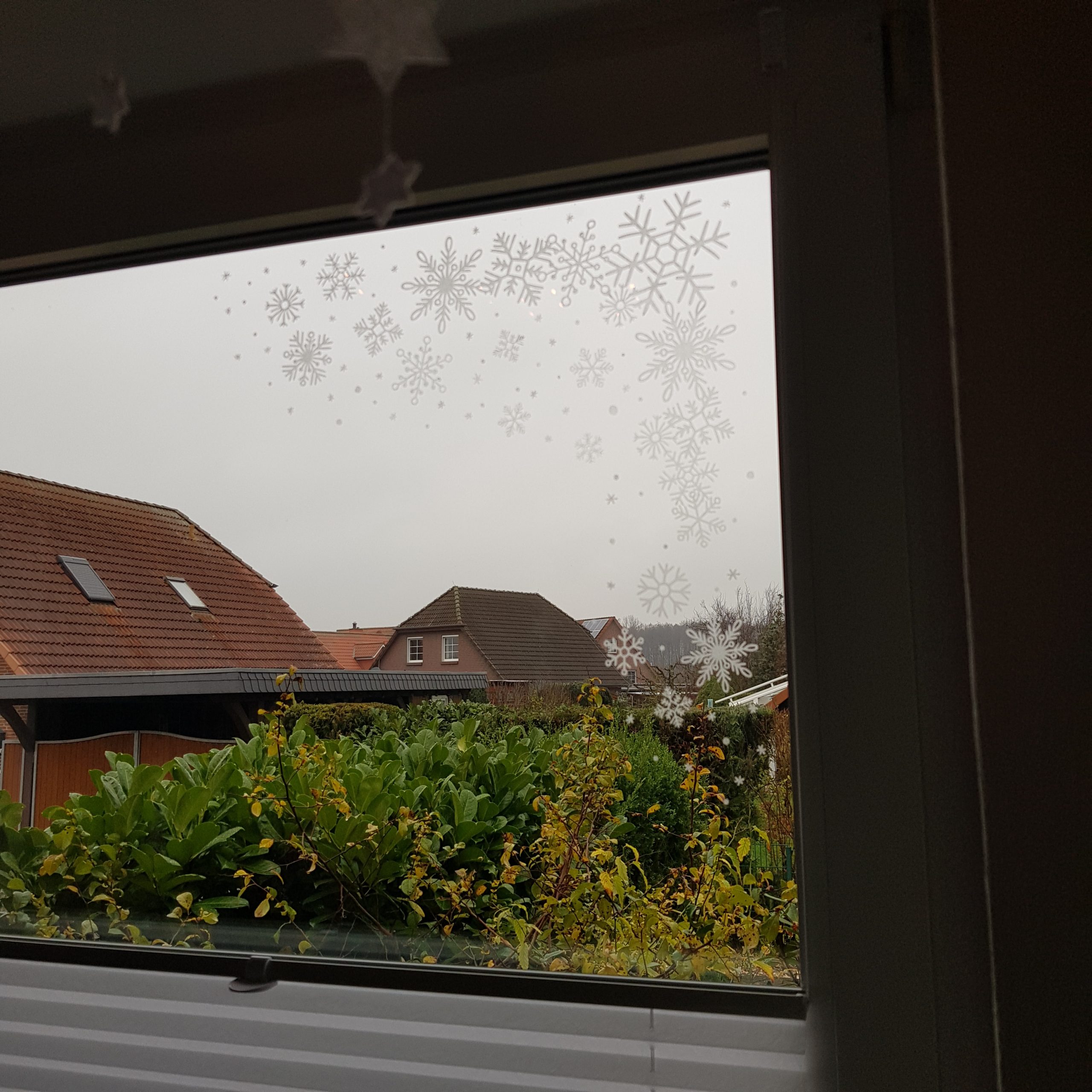 Aus einer statisch haftenden Milchglasfolie habe ich Schneeflocken für unser Küchenfenster geschnitten. Somit bekomme ich die Folie,