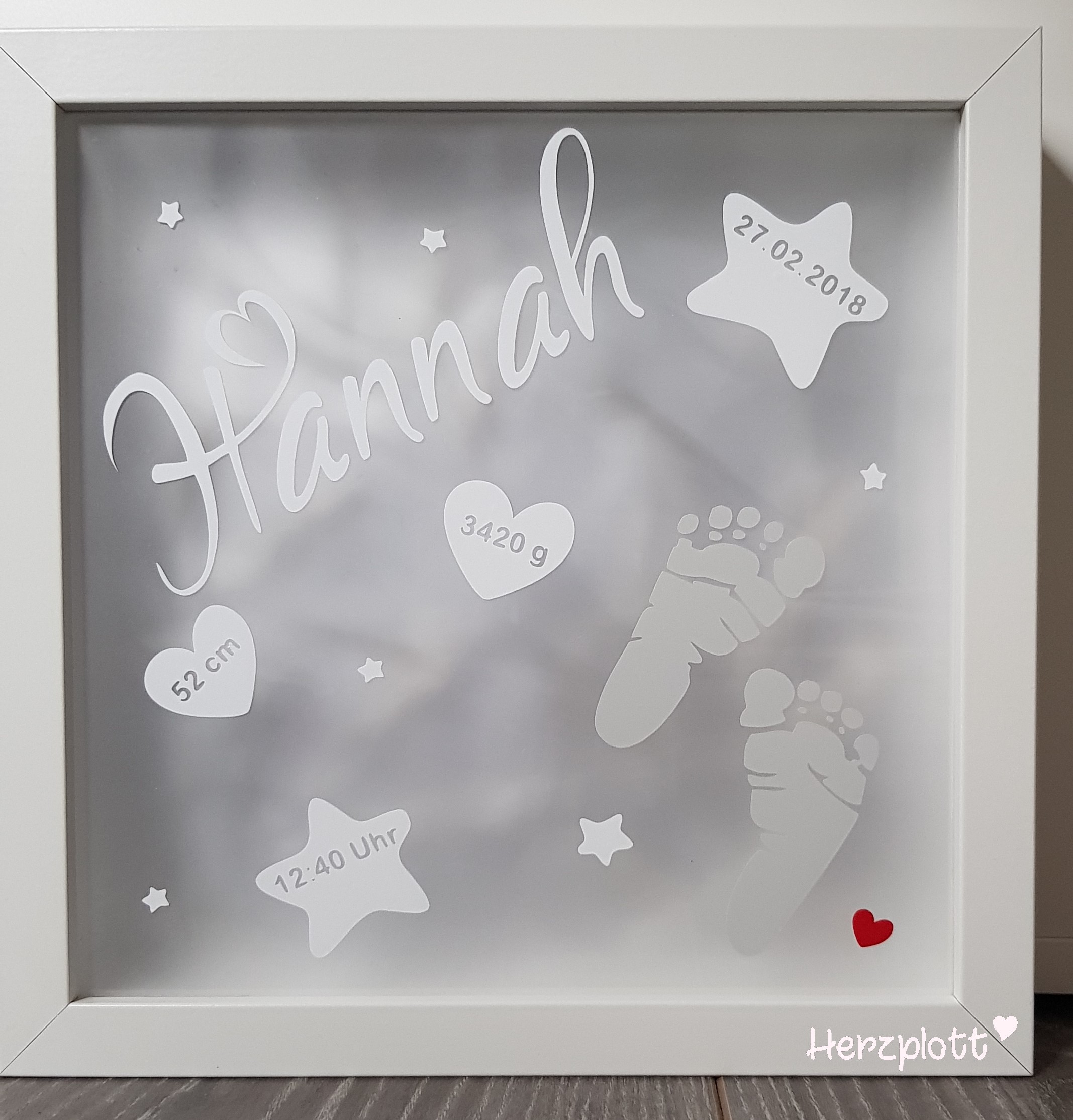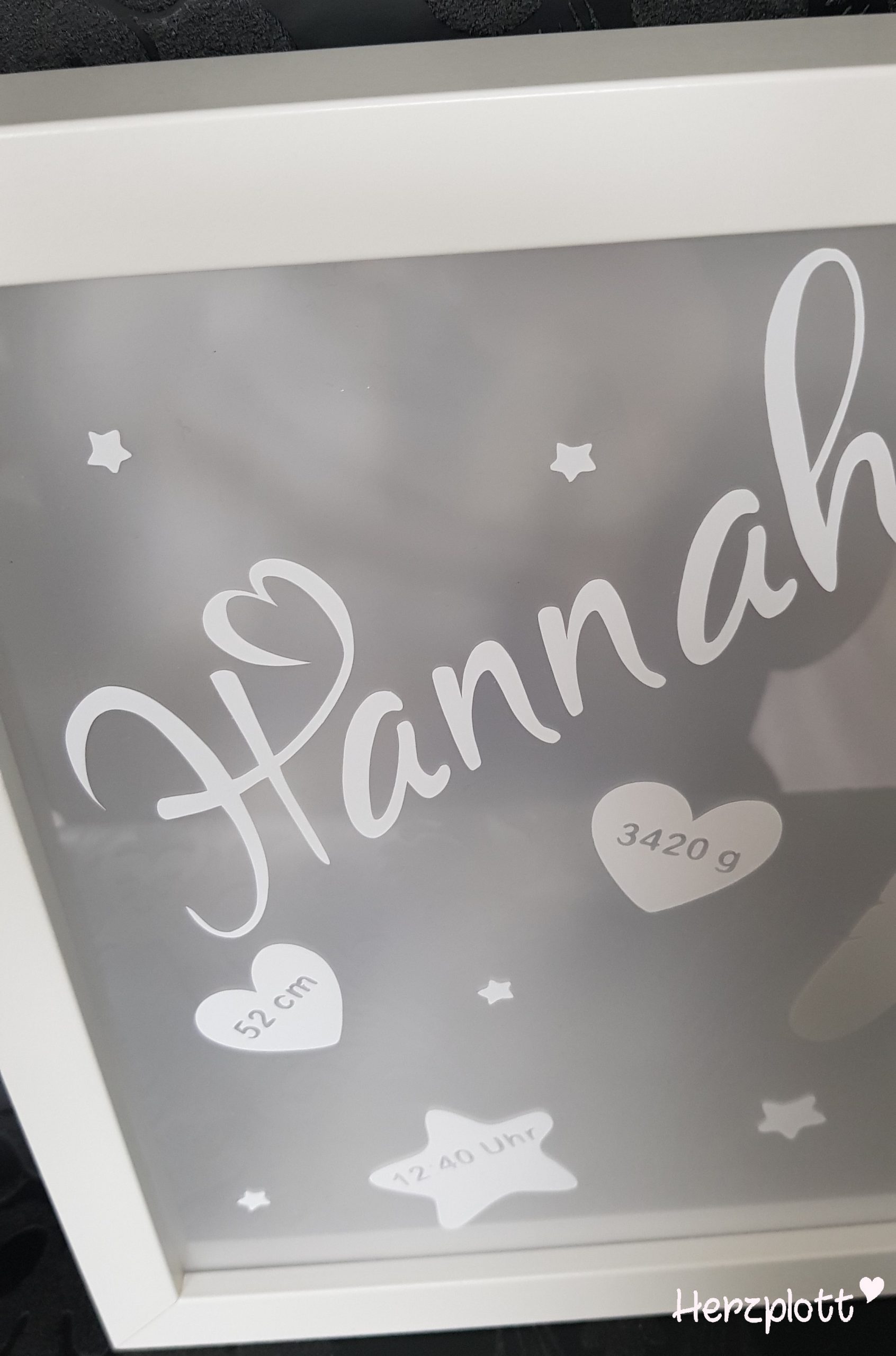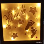 Diesen beleuchteten Rahmen für die kleine Hannah habe ich ganz schlicht, Ton in Ton gehalten. Nur das kleine Herz unten in der Ecke möchte auf sich aufmerksam machen. 😉